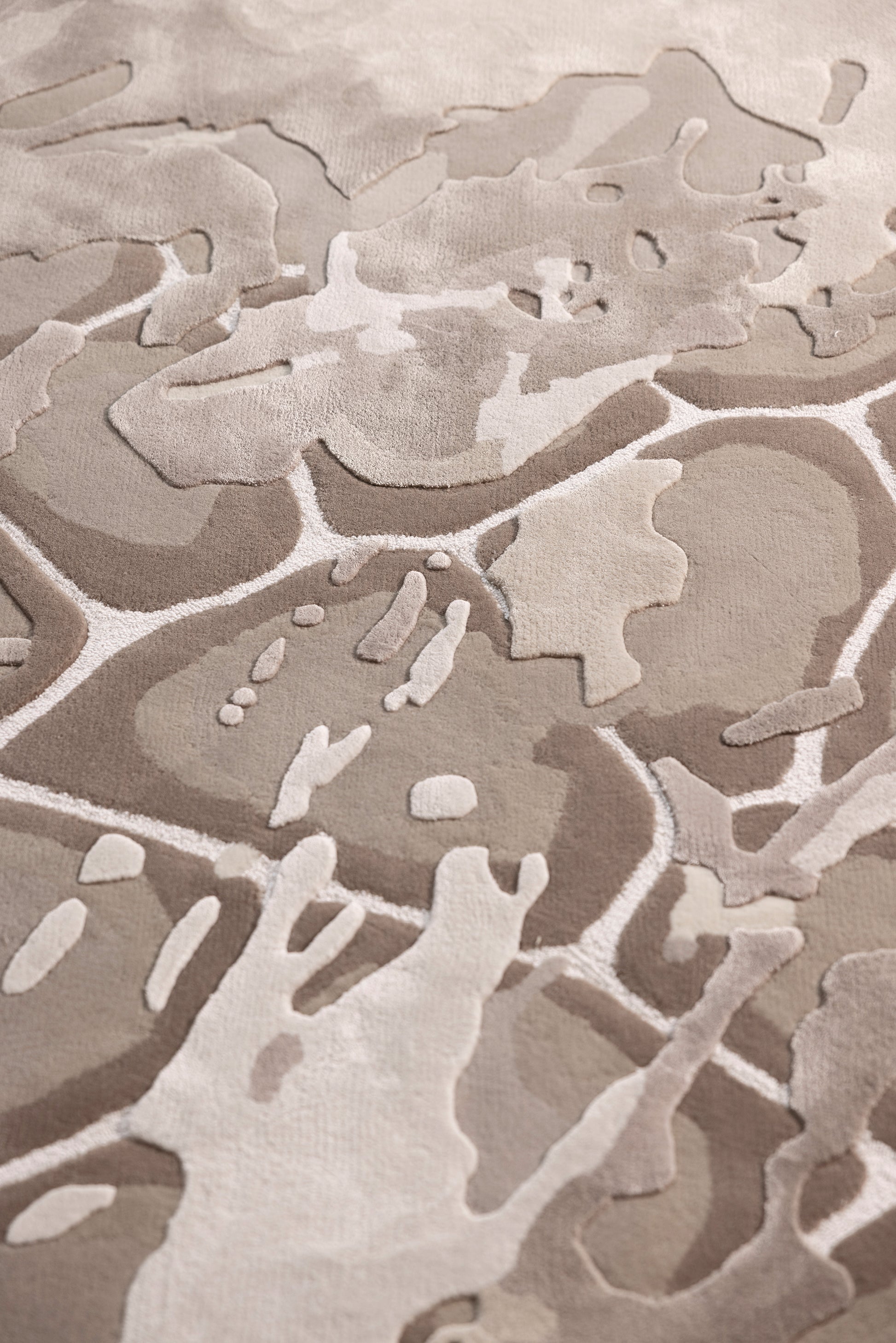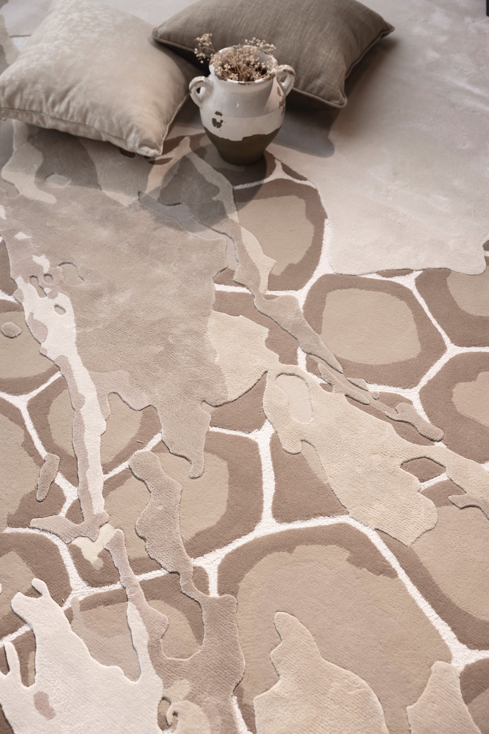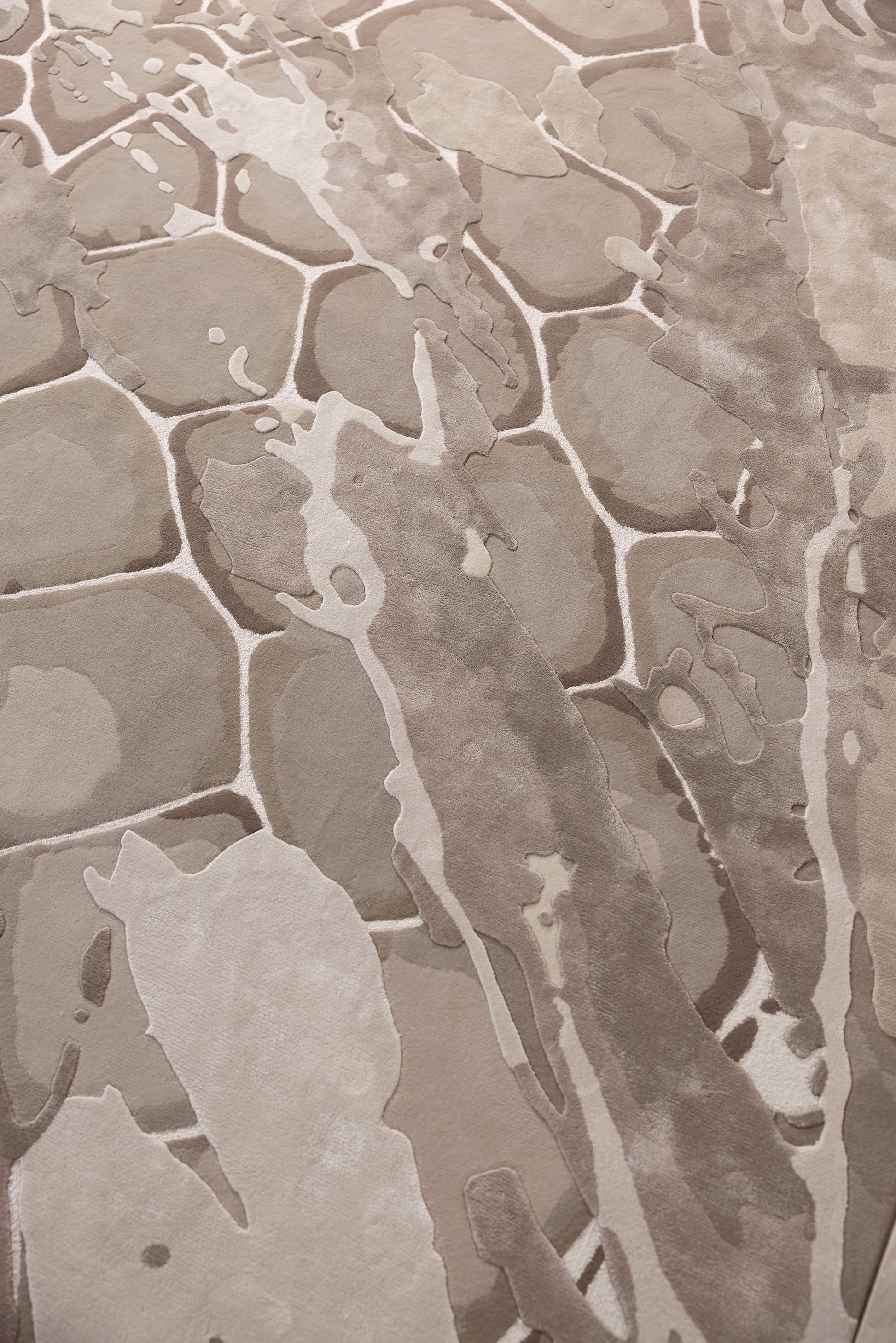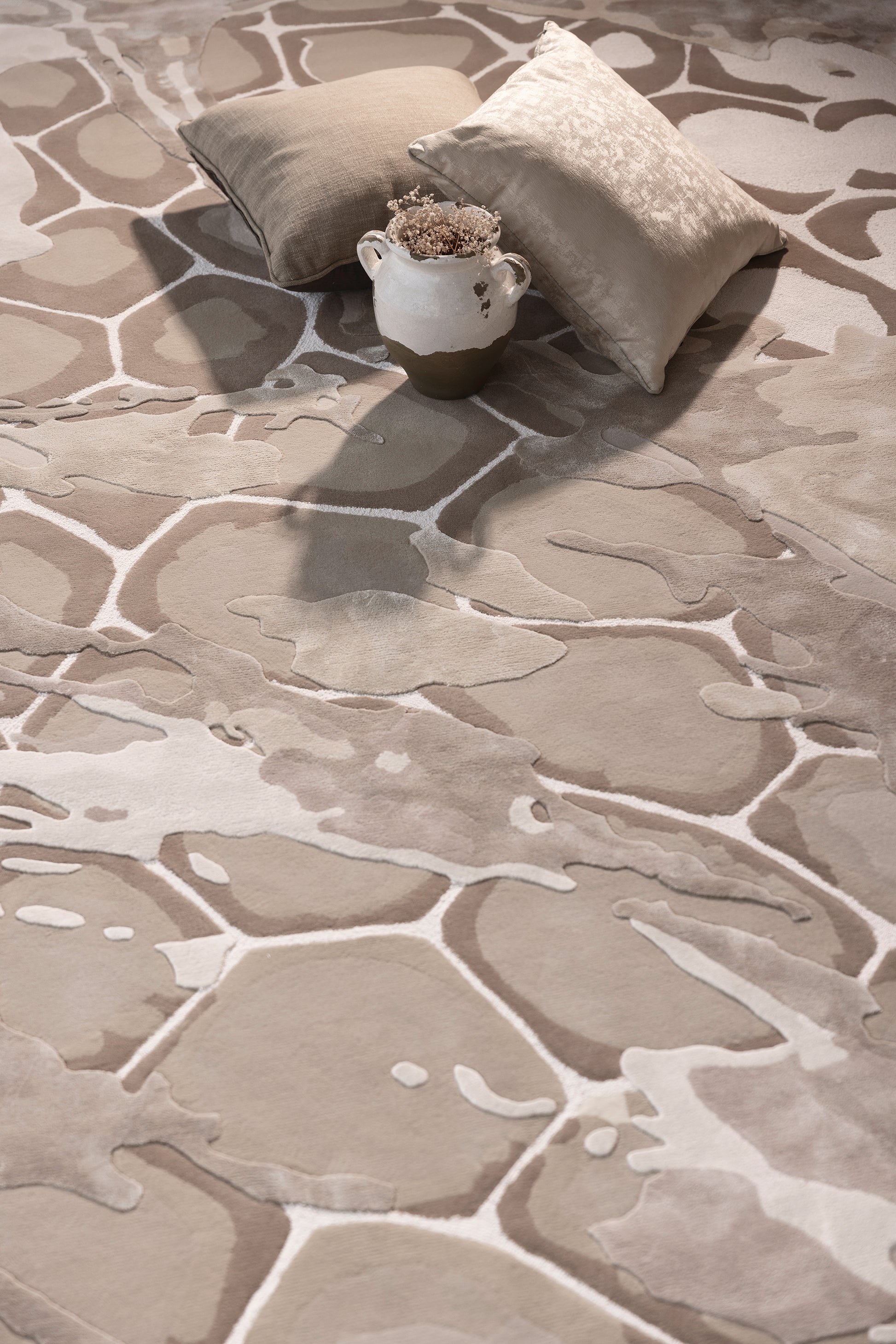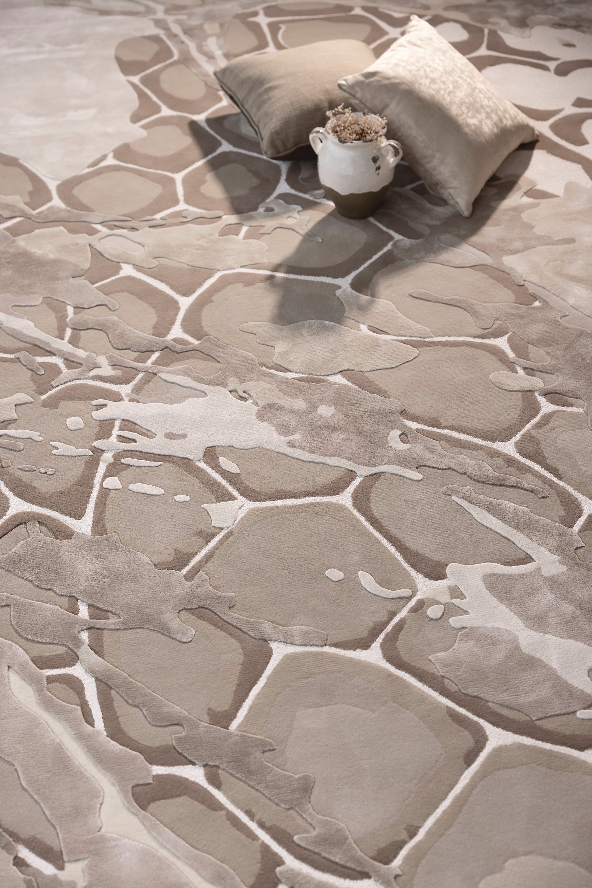An exquisite carpet in neutral tones , celebrating the beauty of nature’s hues, marbled in an almost imperfectly perfect way . An extension of our signature colour fusing technique , this carpet makes a statement with its organic pattern inspired by the delicate wings of a dragonfly . Unusual but characteristic; symbolic with good luck and prosperity.