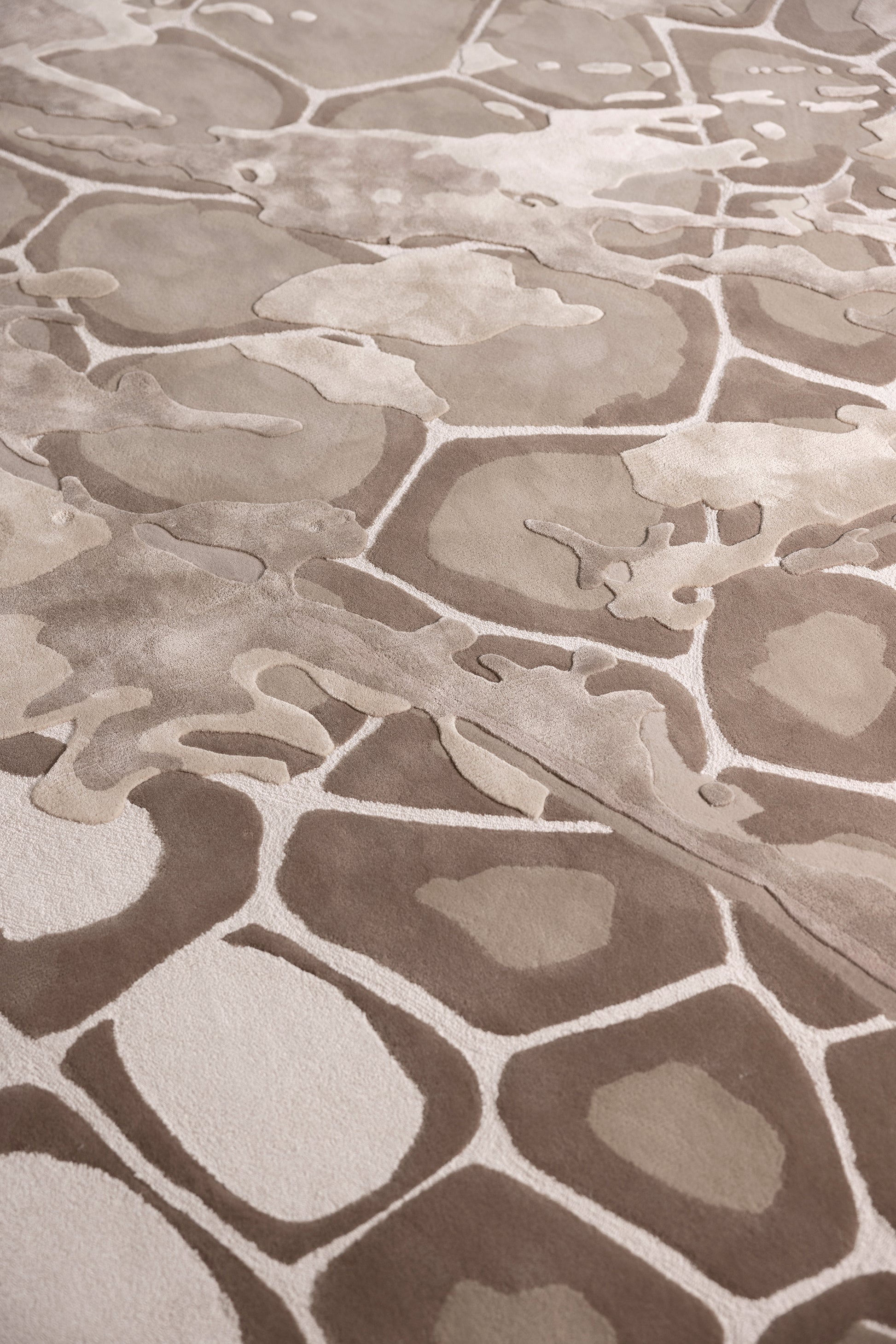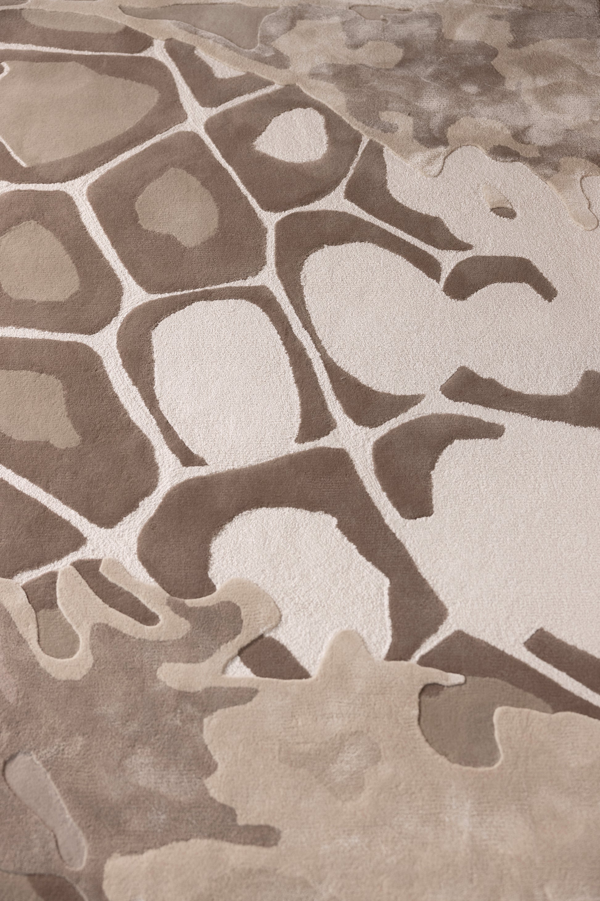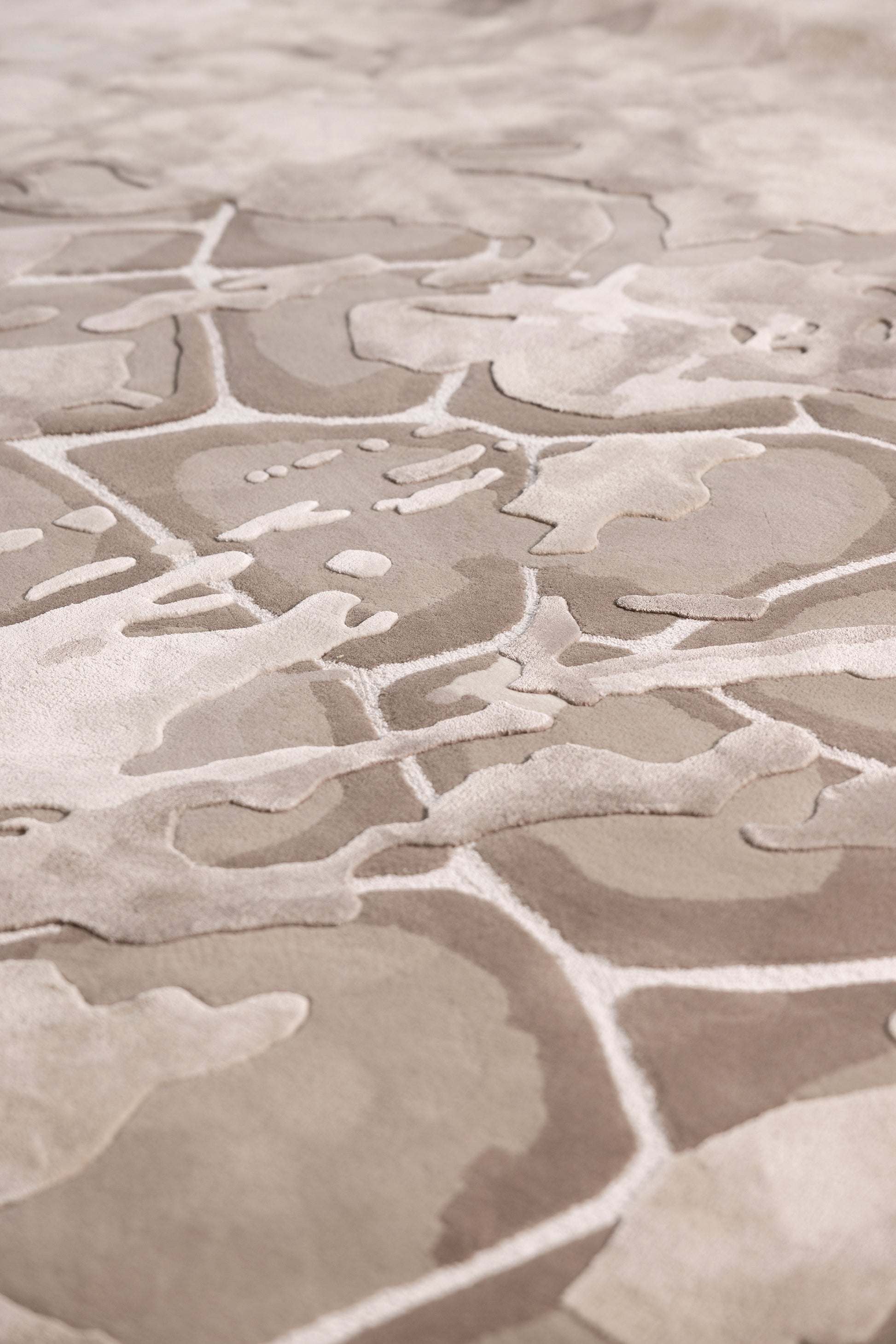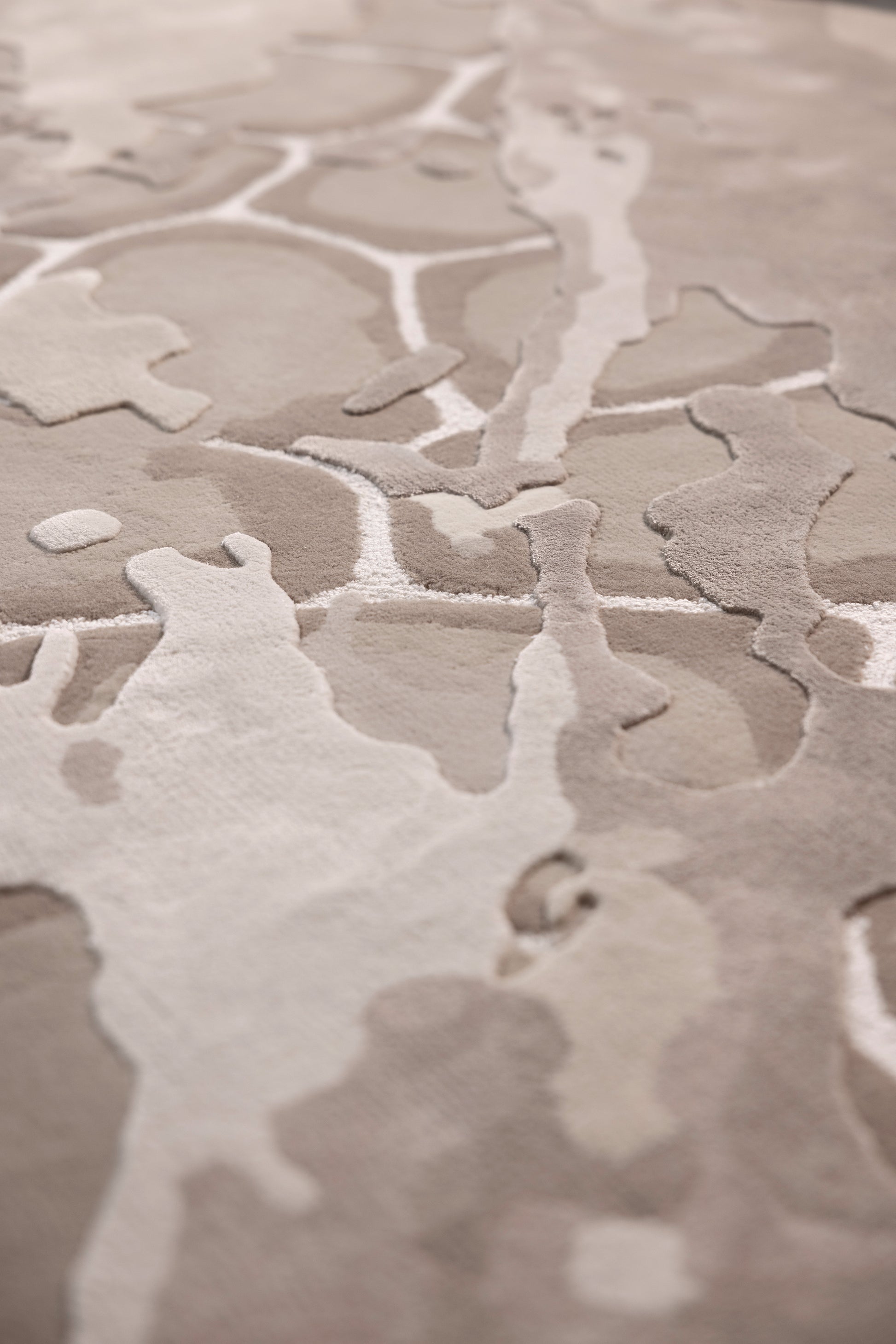 An exquisite carpet in neutral tones , celebrating the beauty of nature’s hues, marbled in an almost imperfectly perfect way . An extension of our signature colour fusing technique , this carpet makes a statement with its organic pattern inspired by the delicate wings of a dragonfly . Unusual but characteristic; symbolic with good luck and prosperity.