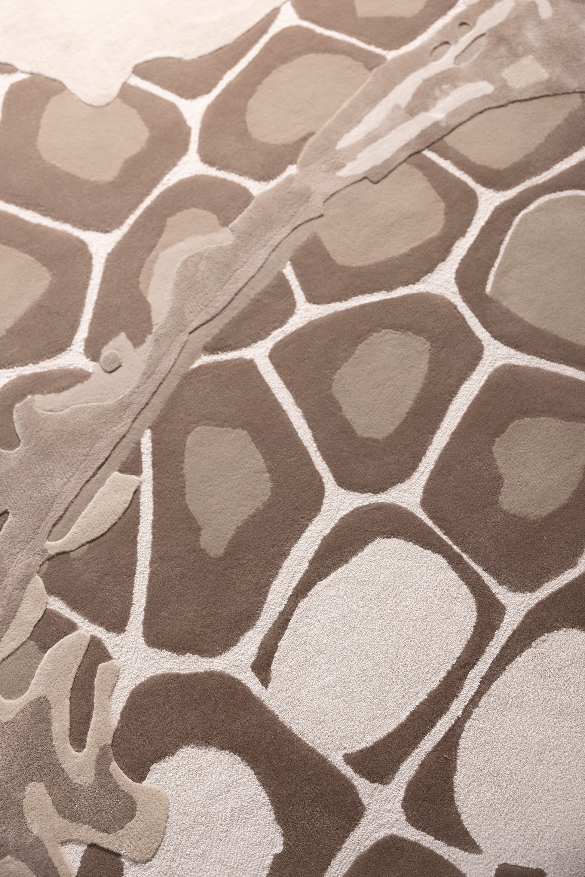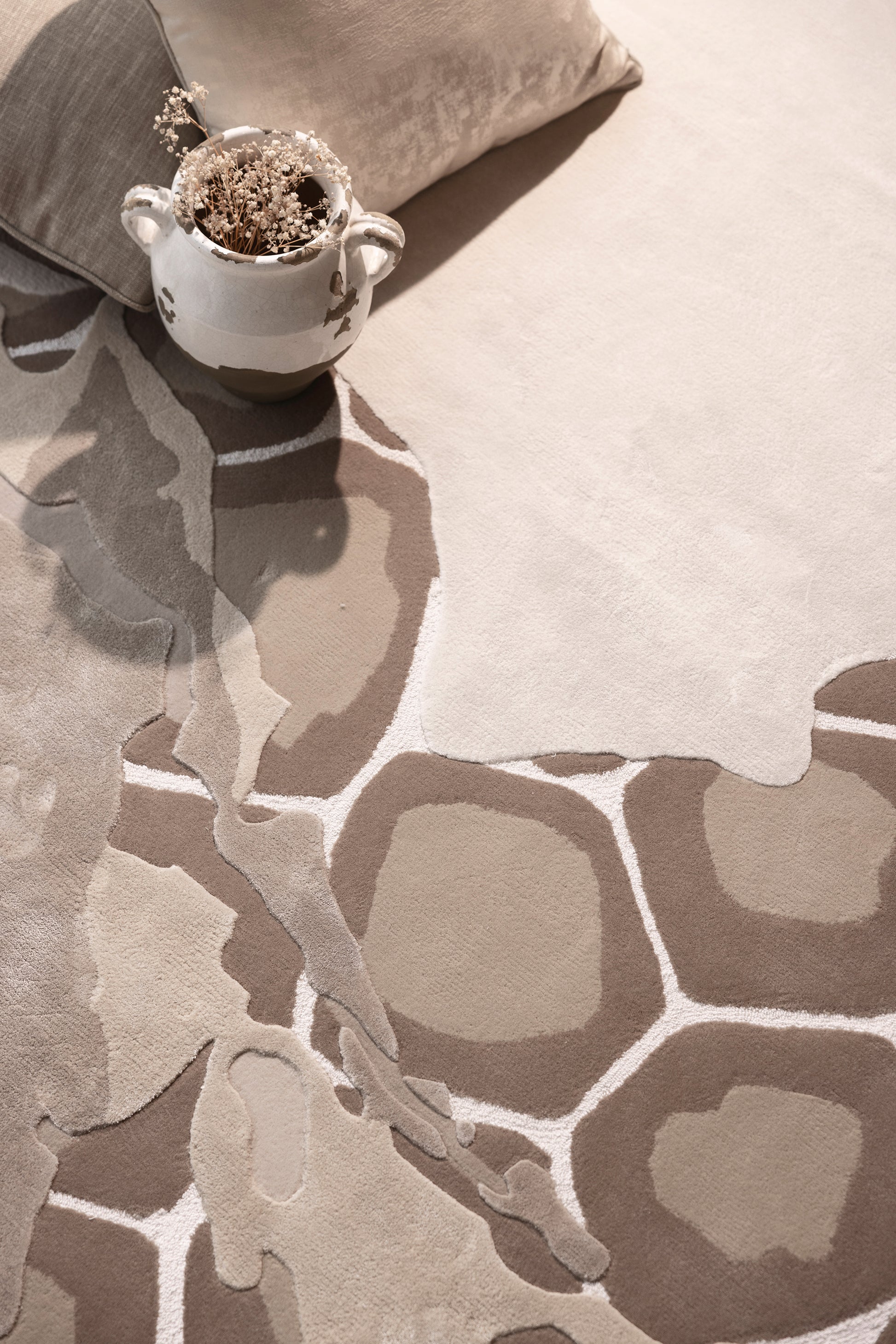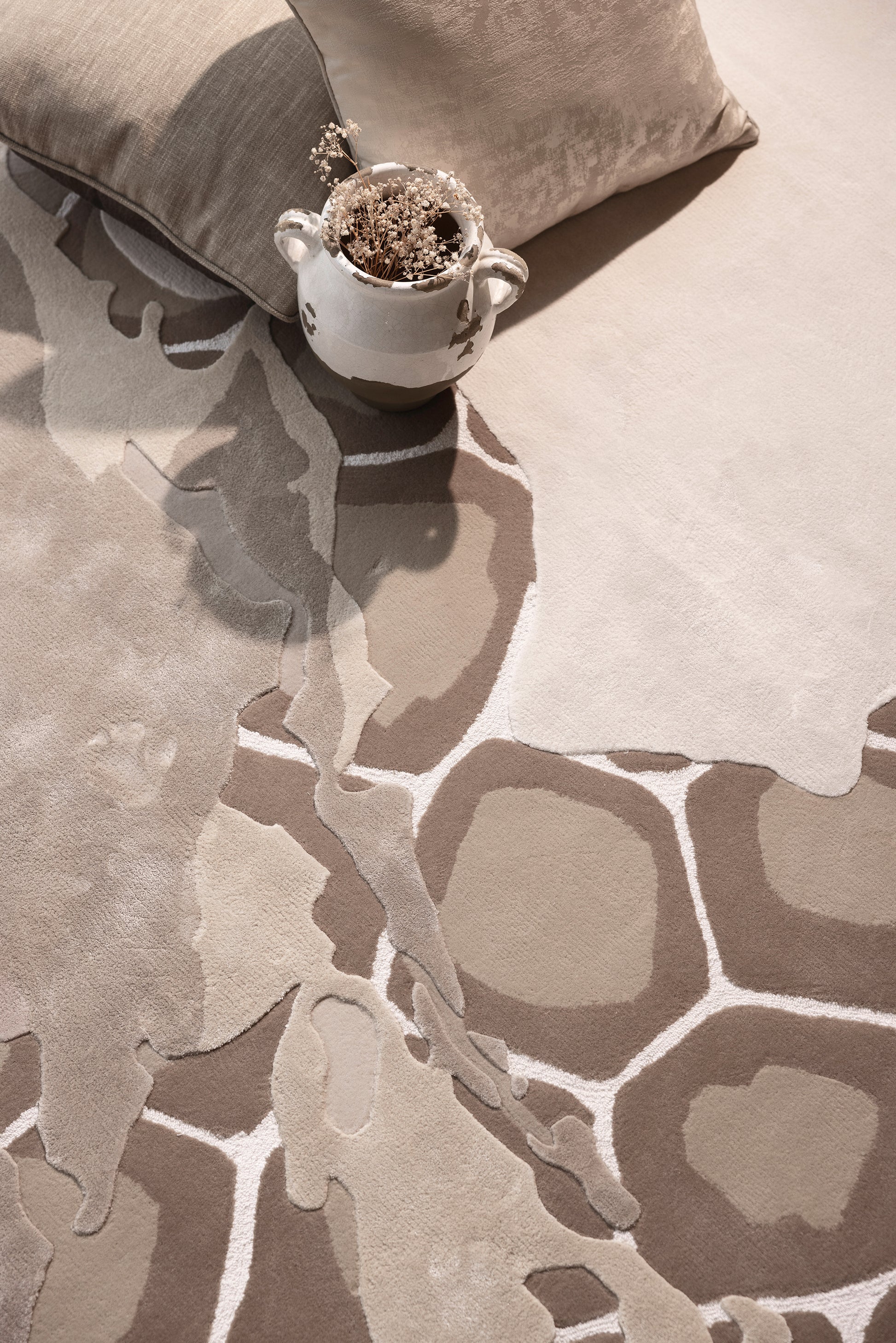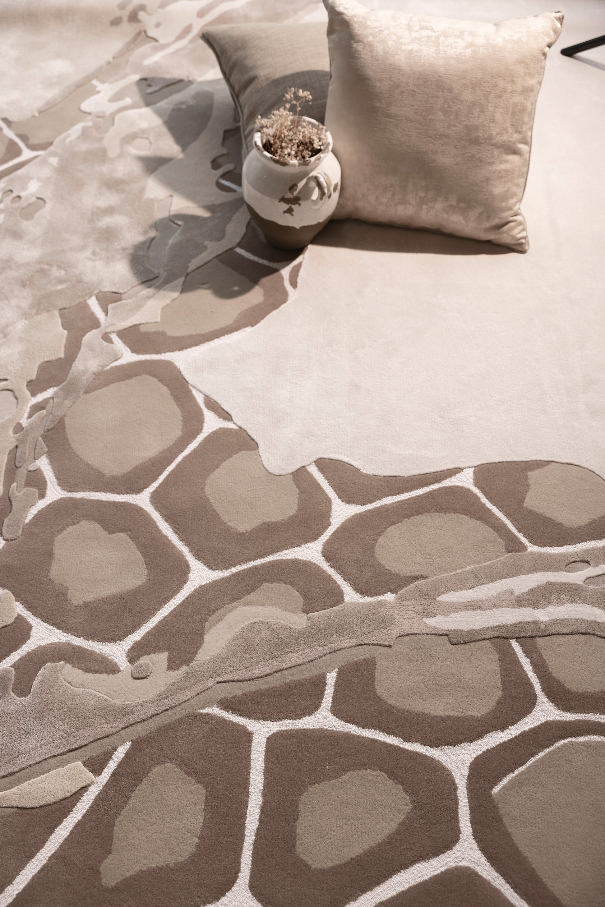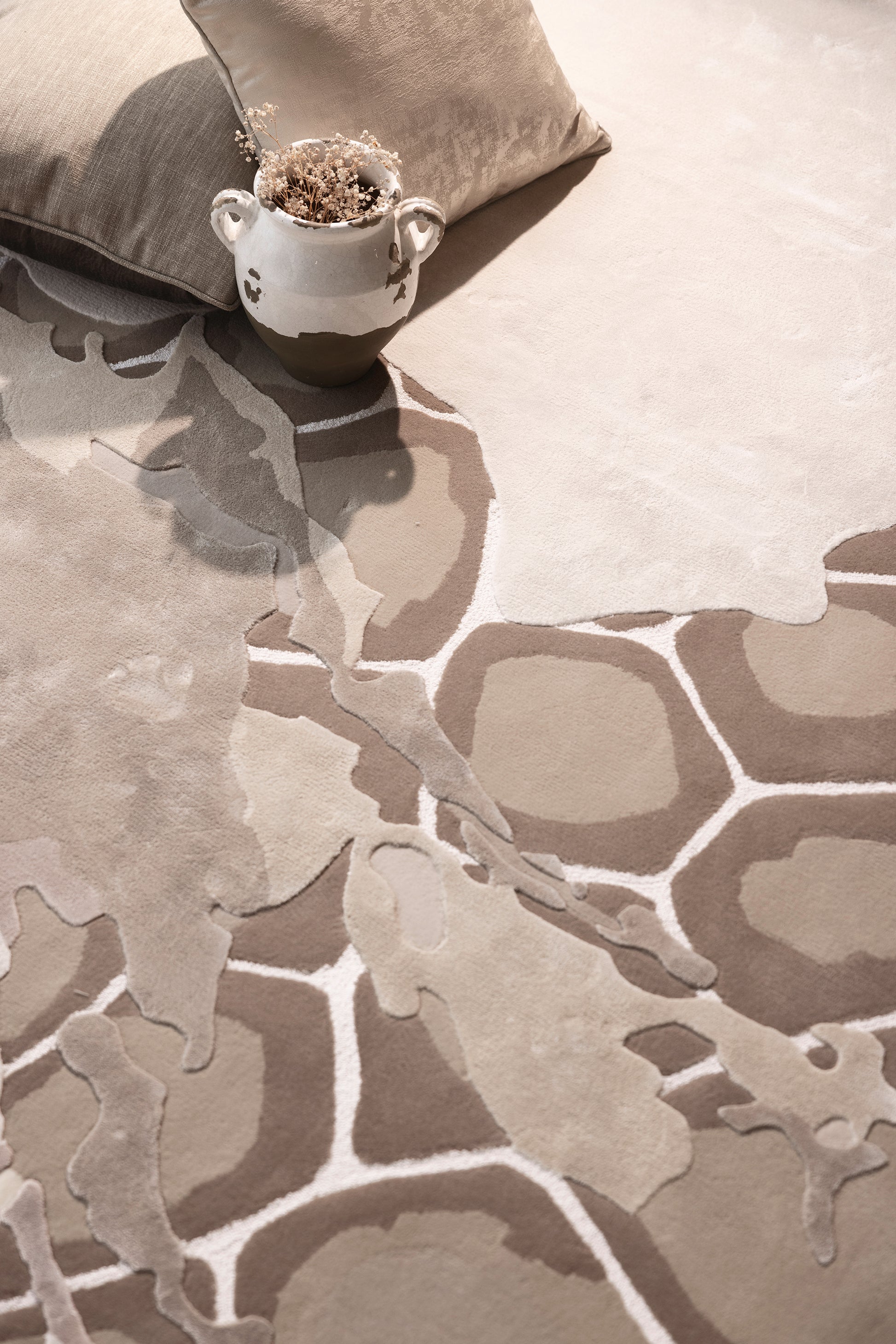 An exquisite carpet in neutral tones , celebrating the beauty of nature’s hues, marbled in an almost imperfectly perfect way . An extension of our signature colour fusing technique , this carpet makes a statement with its organic pattern inspired by the delicate wings of a dragonfly . Unusual but characteristic; symbolic with good luck and prosperity.