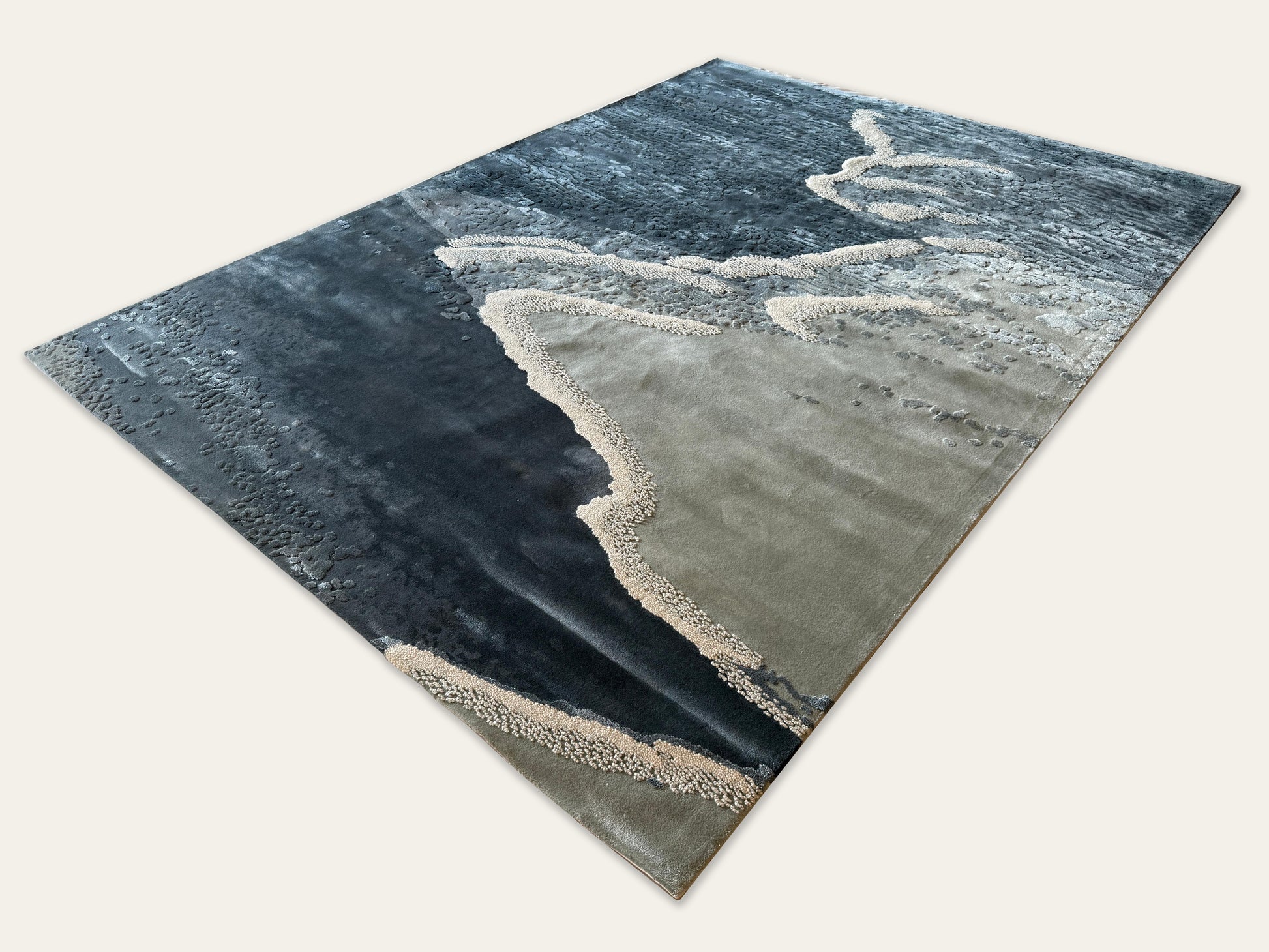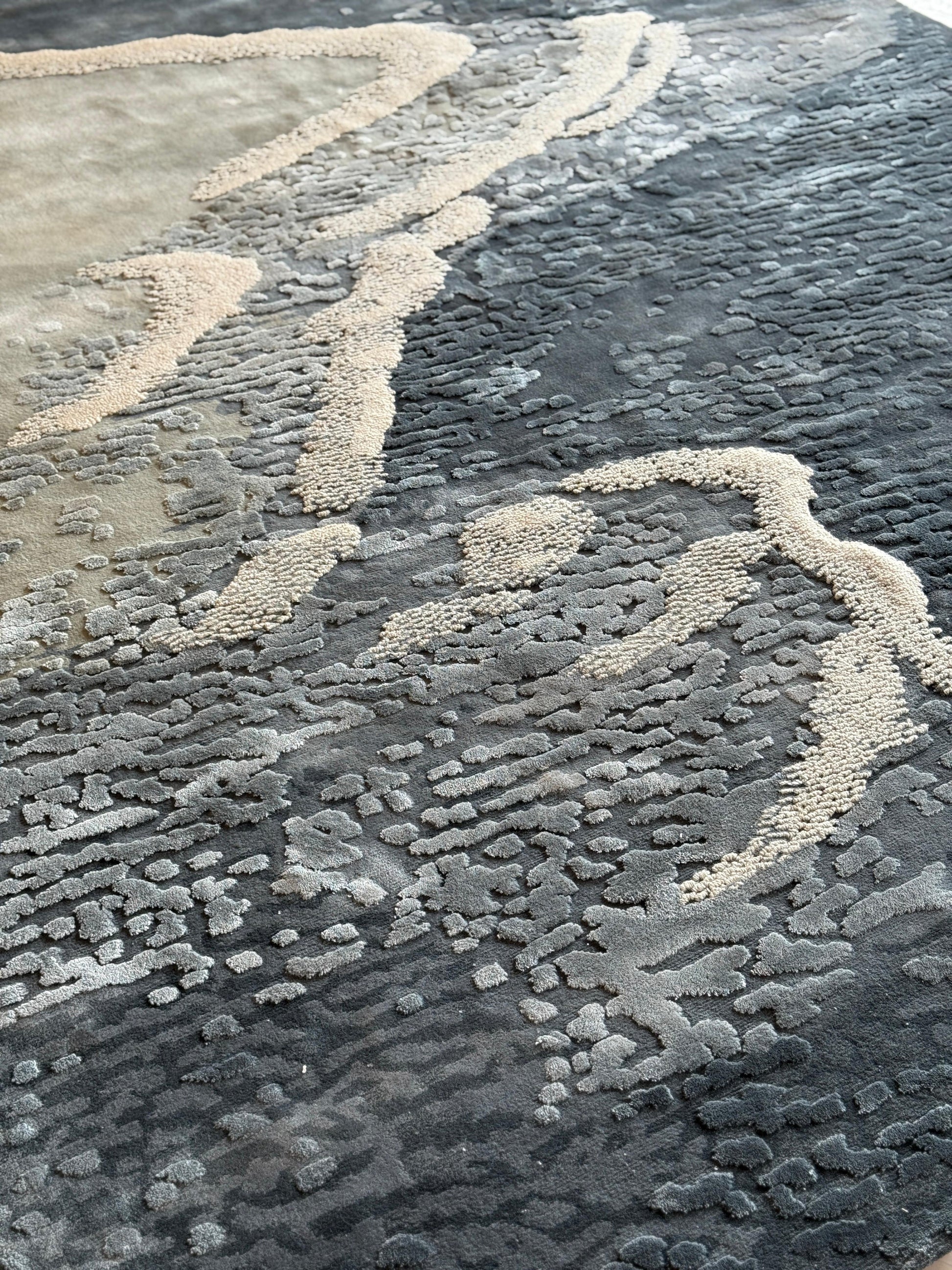 Cascading  ripples brushing the shores with an ornate sea foam, Interspersed with graceful ships and scattered pearls, evoking Qatar’s rich pearl diving heritage. The design balances fluidity and tradition, rendering  a timeless elegance.