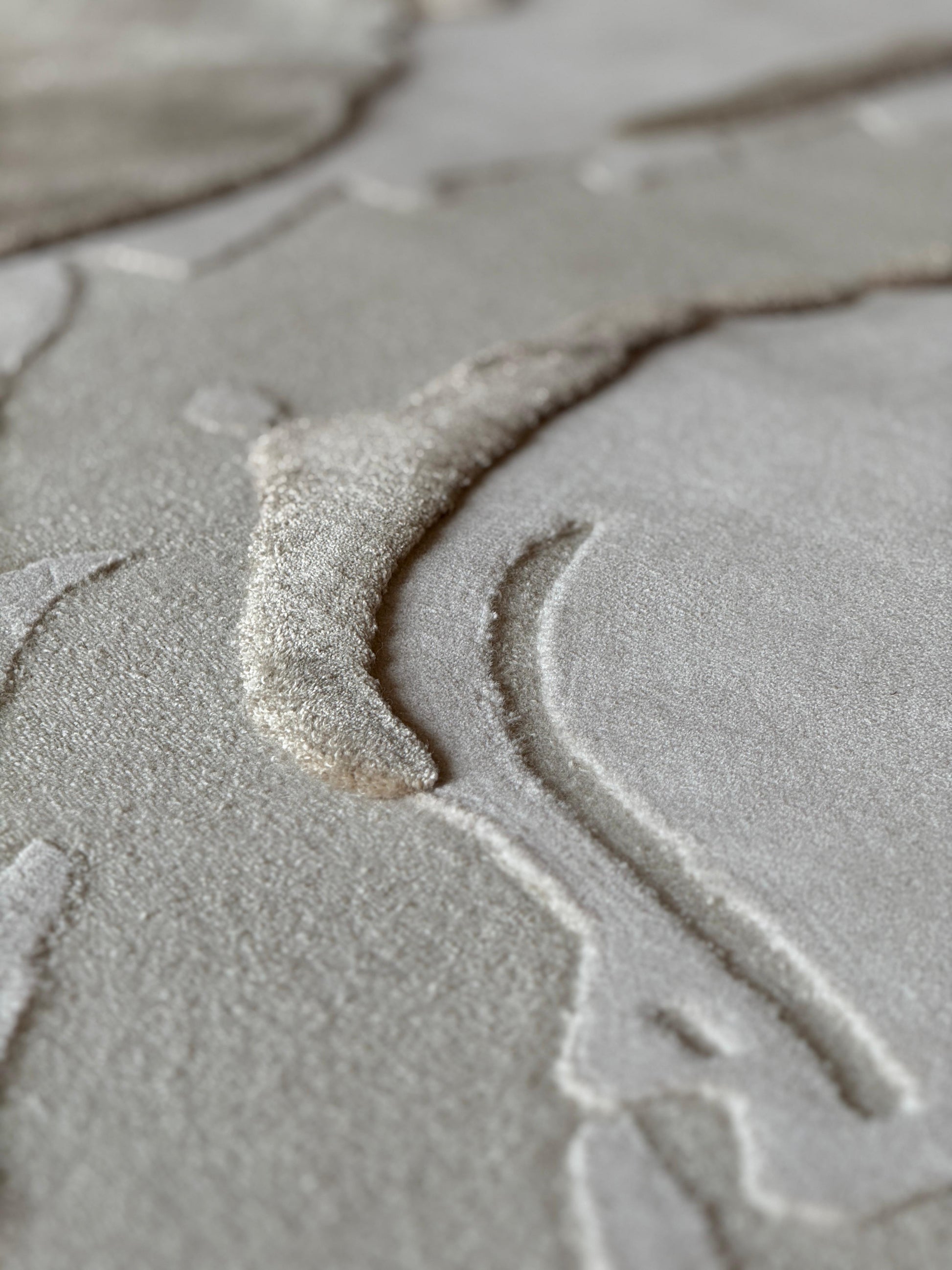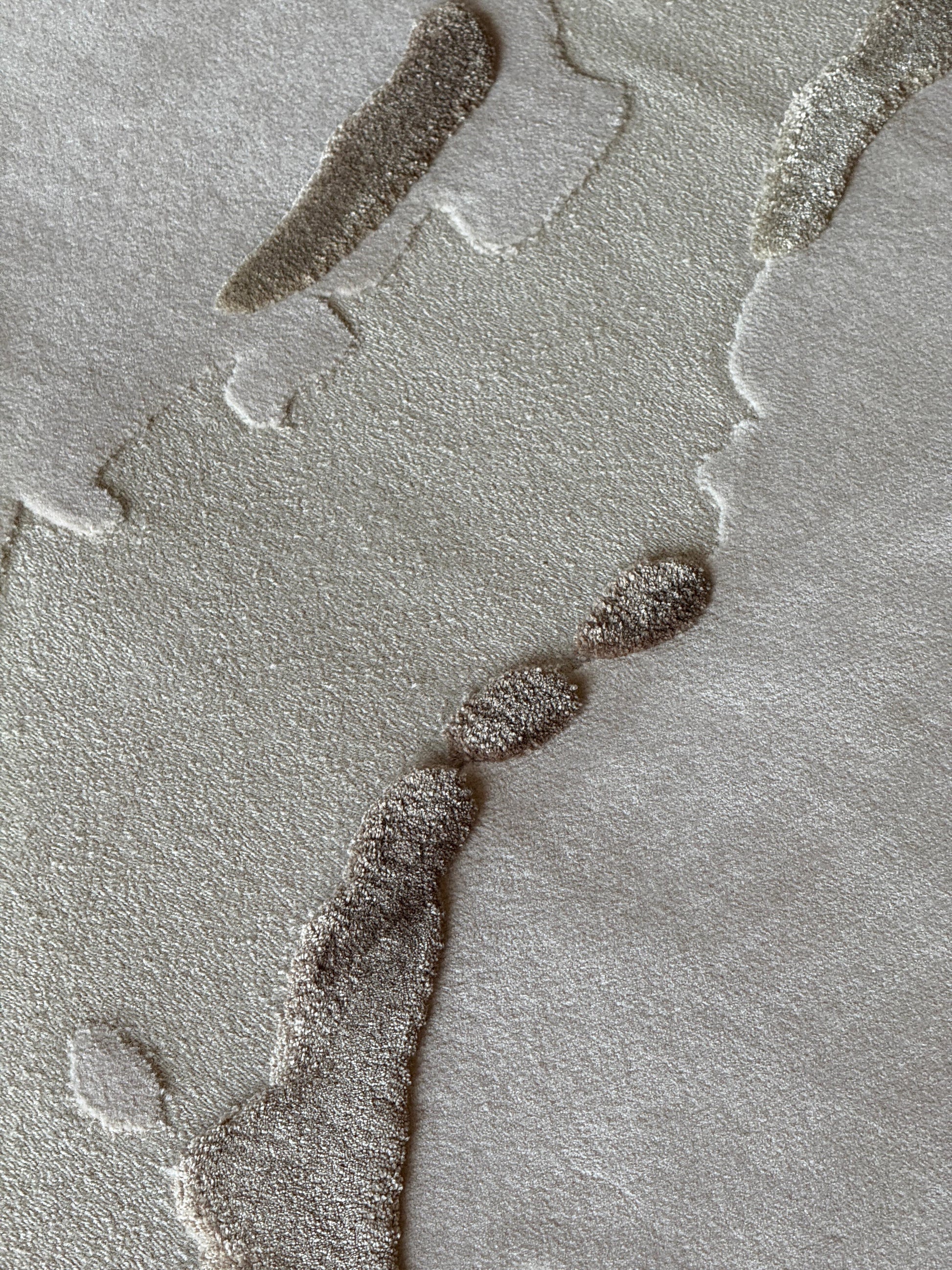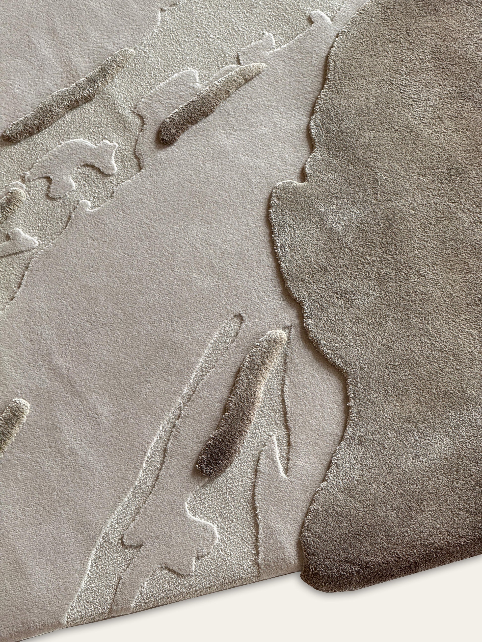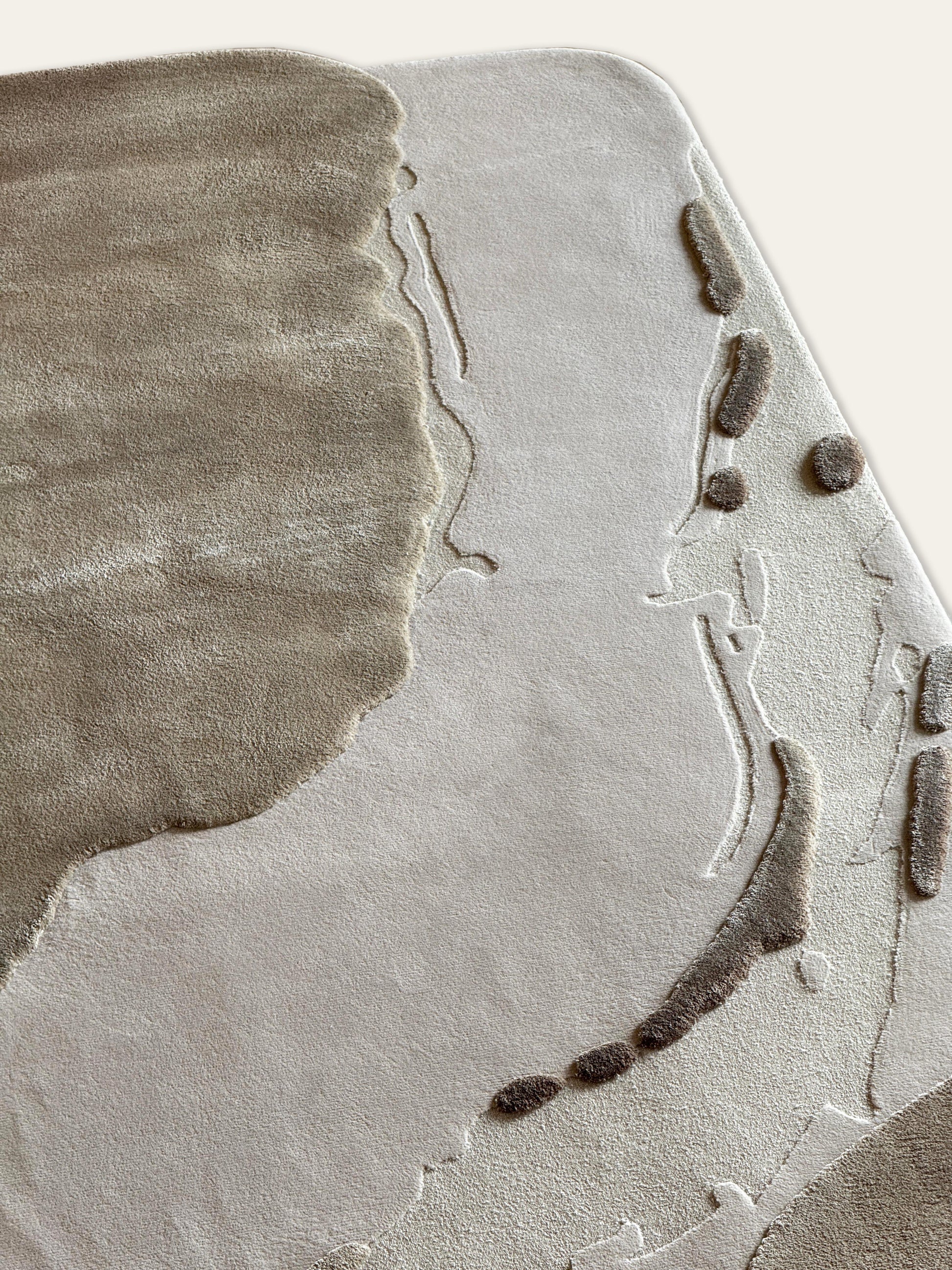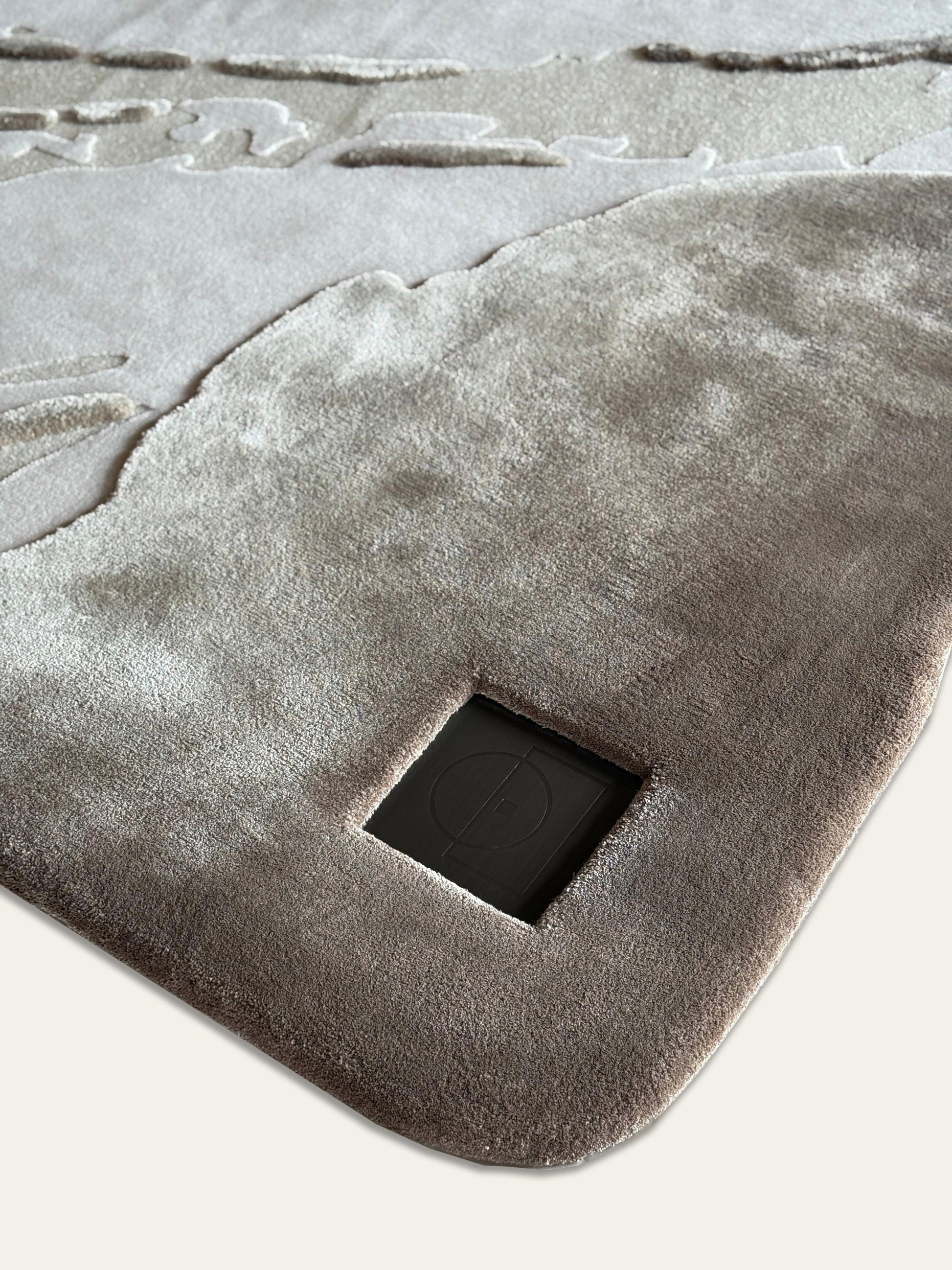 Abstract patterns capture water flowing through arid mountain ranges, blending fluidity with rugged terrain. With a luxurious thick pile and the ZUMA matte black metal logo inlaid on one side, this one-of-a-kind design commands attention and elevates any living room or open space with its dramatic artistry and refined presence.