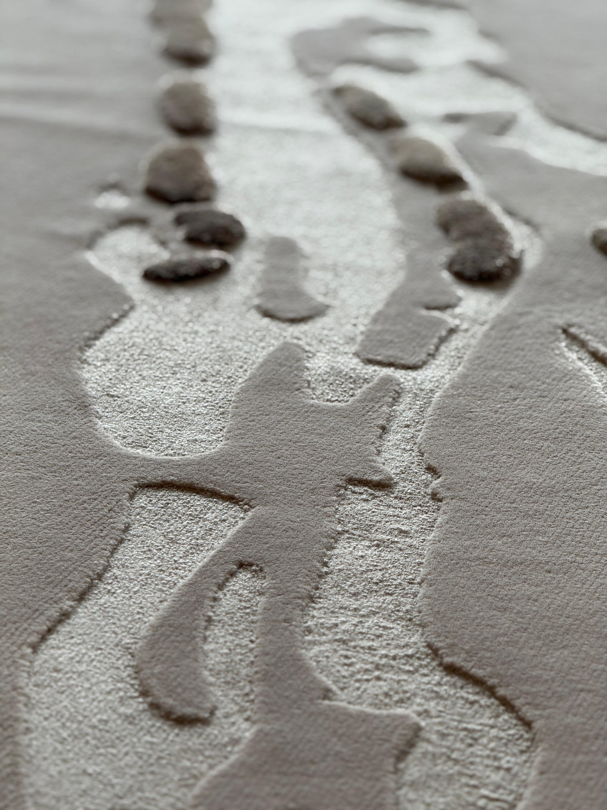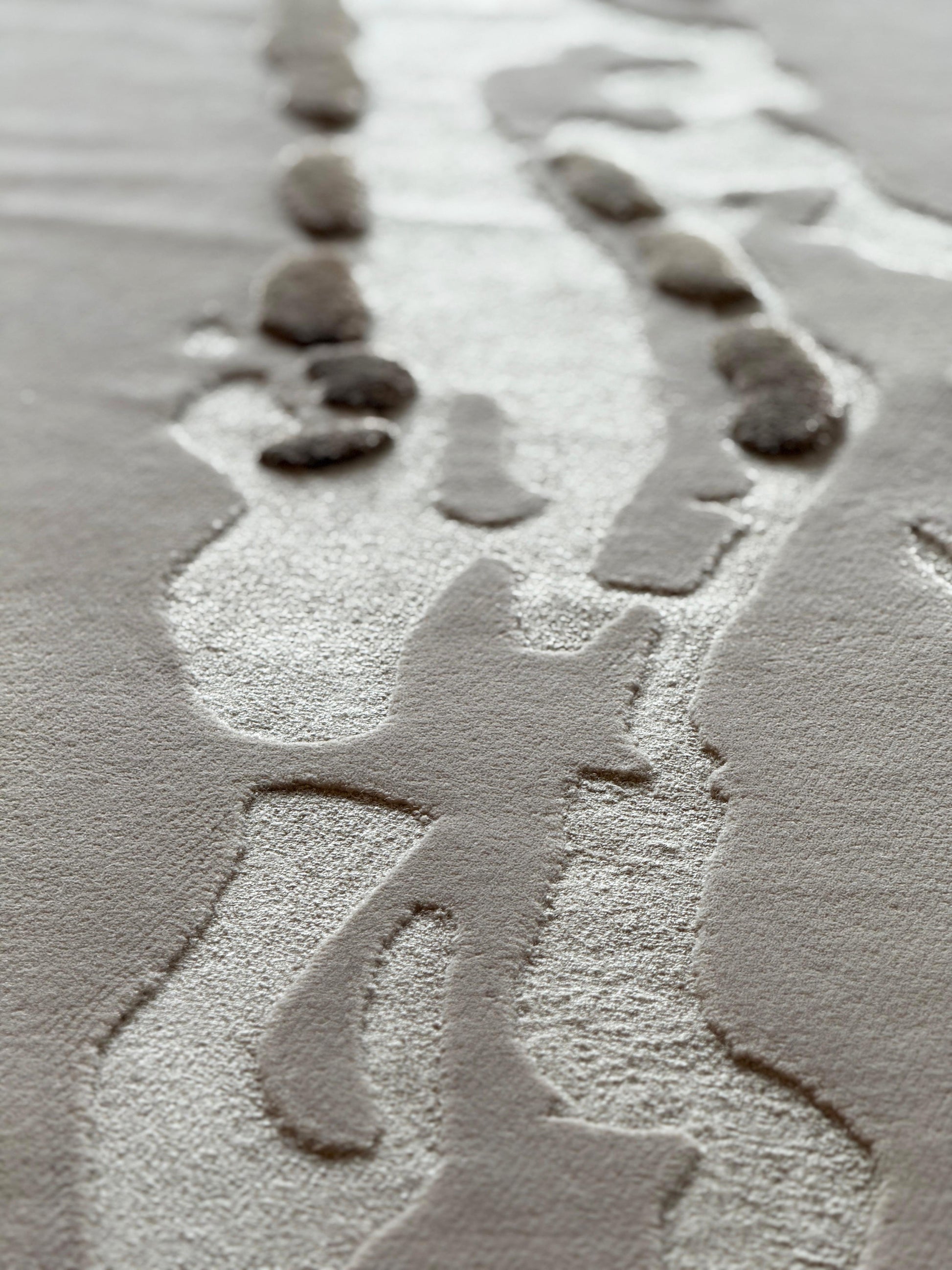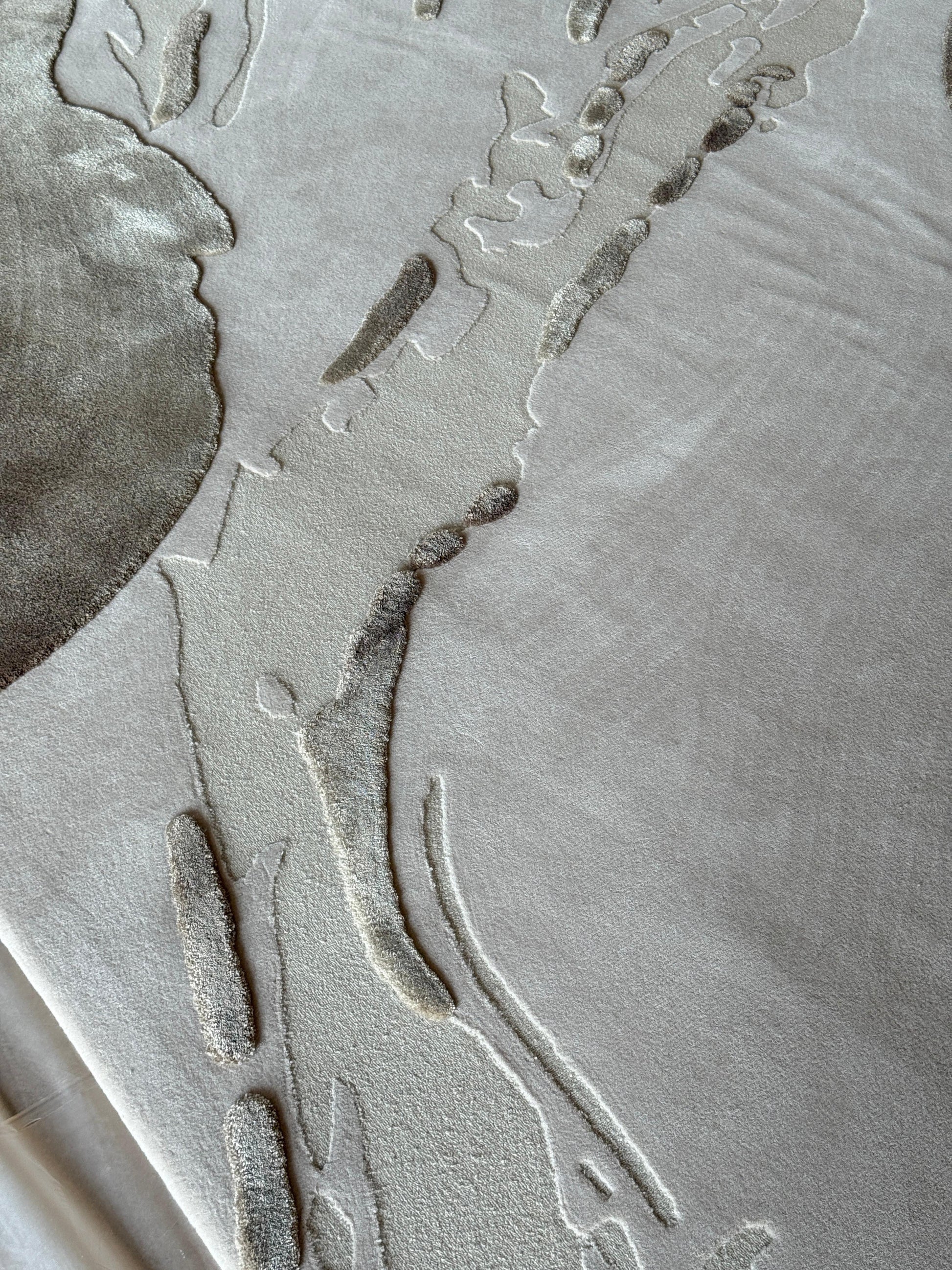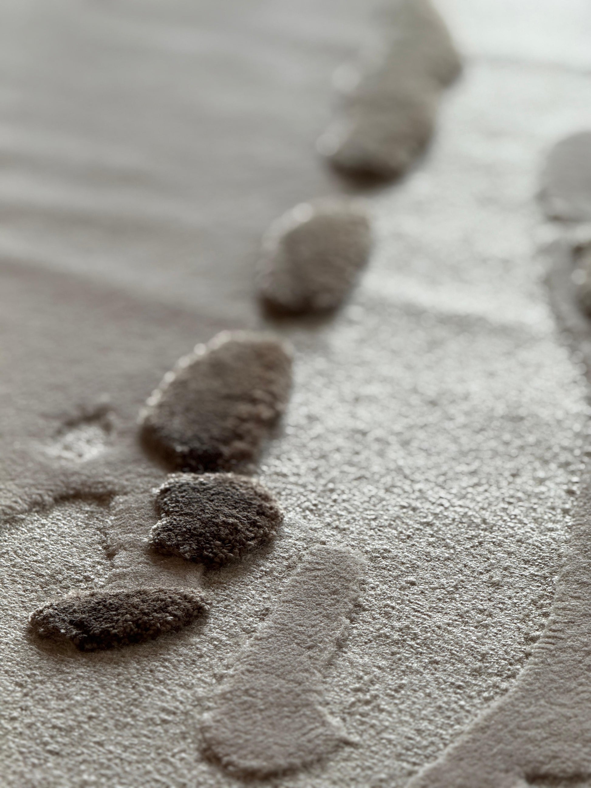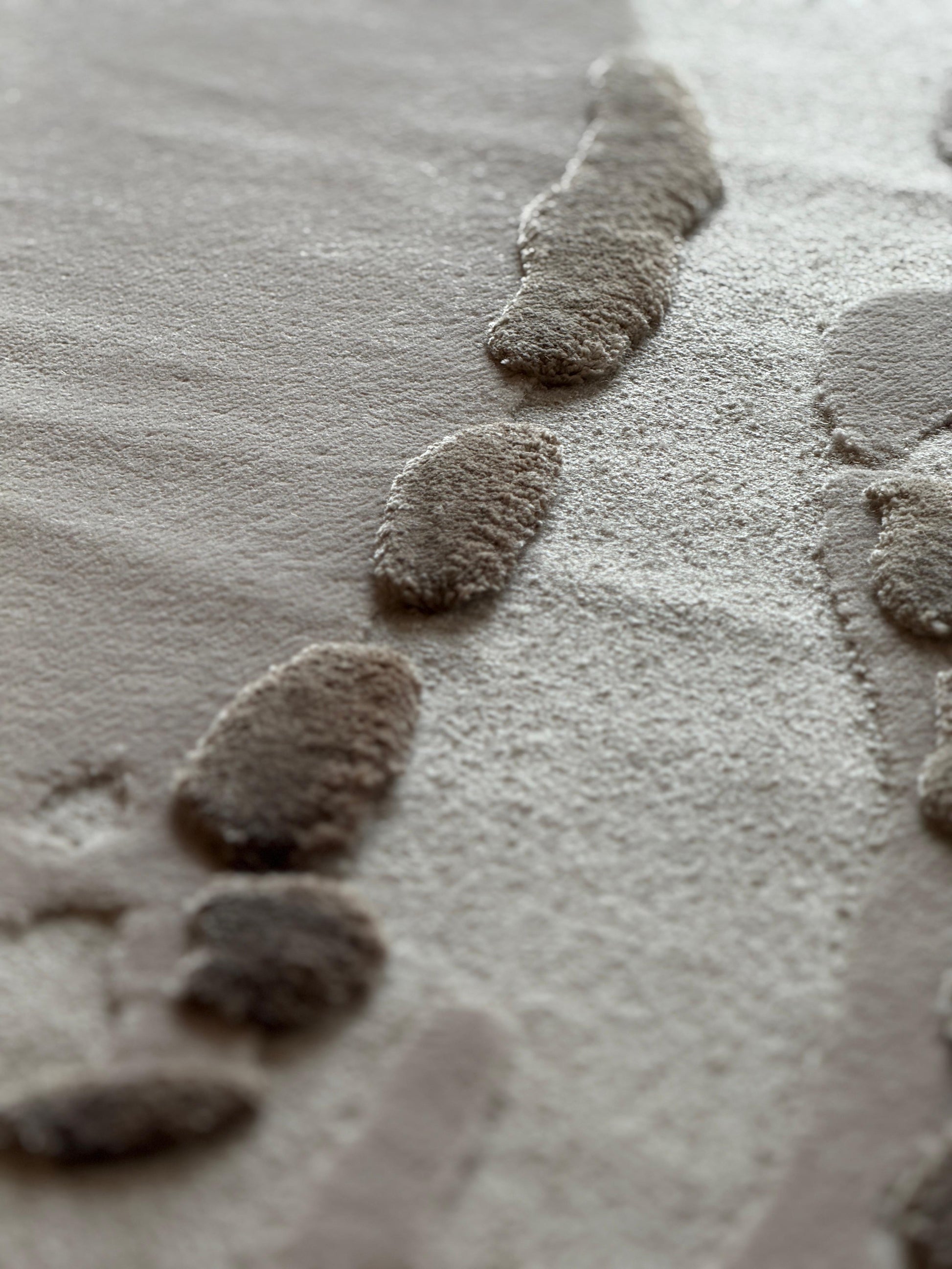 Abstract patterns capture water flowing through arid mountain ranges, blending fluidity with rugged terrain. With a luxurious thick pile and the ZUMA matte black metal logo inlaid on one side, this one-of-a-kind design commands attention and elevates any living room or open space with its dramatic artistry and refined presence.